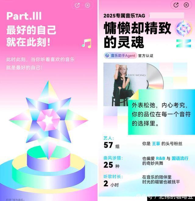 最近被各种年度报告搞得眼花缭乱,但当我打开华为音乐年度听歌报告,还是被它精准的“刀法”给惊到了,它没用数据砸我,而是用几句歌词、几个关键词,就把我2025的心事轻轻揭开了。我的「2025专属音乐标签」竟然写着:懒惰却精致的灵魂。我一边嘴上说着“这什么鬼”,一边心里疯狂点头。这概括,绝了!这不正是我,歌单杂乱中自有品位,懒于社交却乐于沉浸在音乐世界里的模样吗?